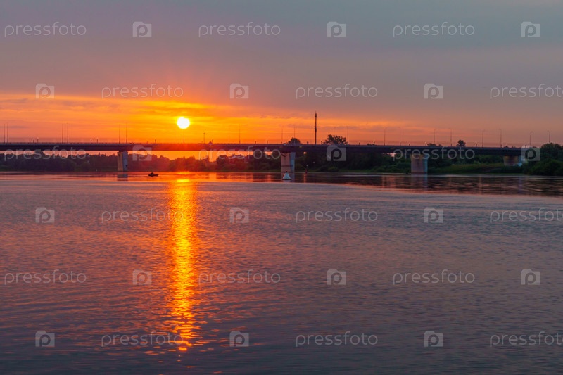 Красивый летний восход солнца над рекой. Мост на фоне восхода солнца летним утром