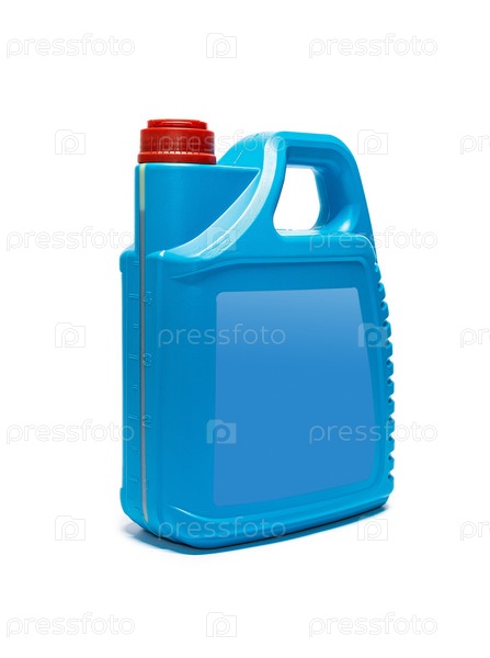 Пластиковая канистра с компрессорным маслом на белом фоне. Фото высокого качества