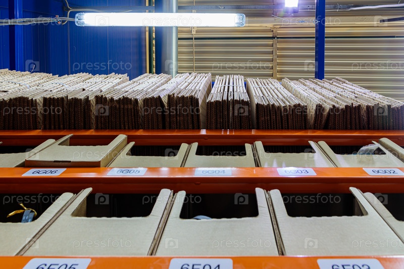 Коробки на стеллажах на складе товаров крупным планом. Фото высокого качества