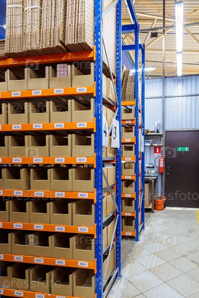 Высокие стеллажи на складе товаров. Фото высокого качества