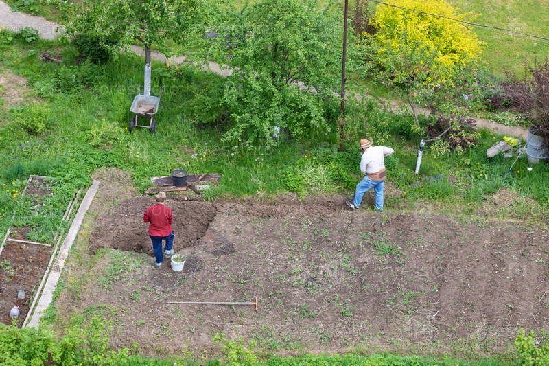 Взрослая пара перекапывает свой участок земли на даче под посев картошки