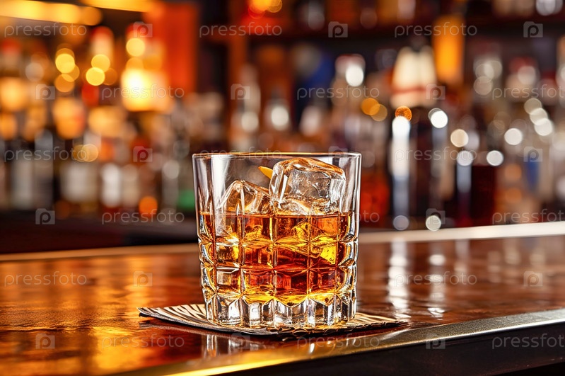 Стакан виски со льдом на барной стойке. Генеративный ИИ. Иллюстрация высокого качества