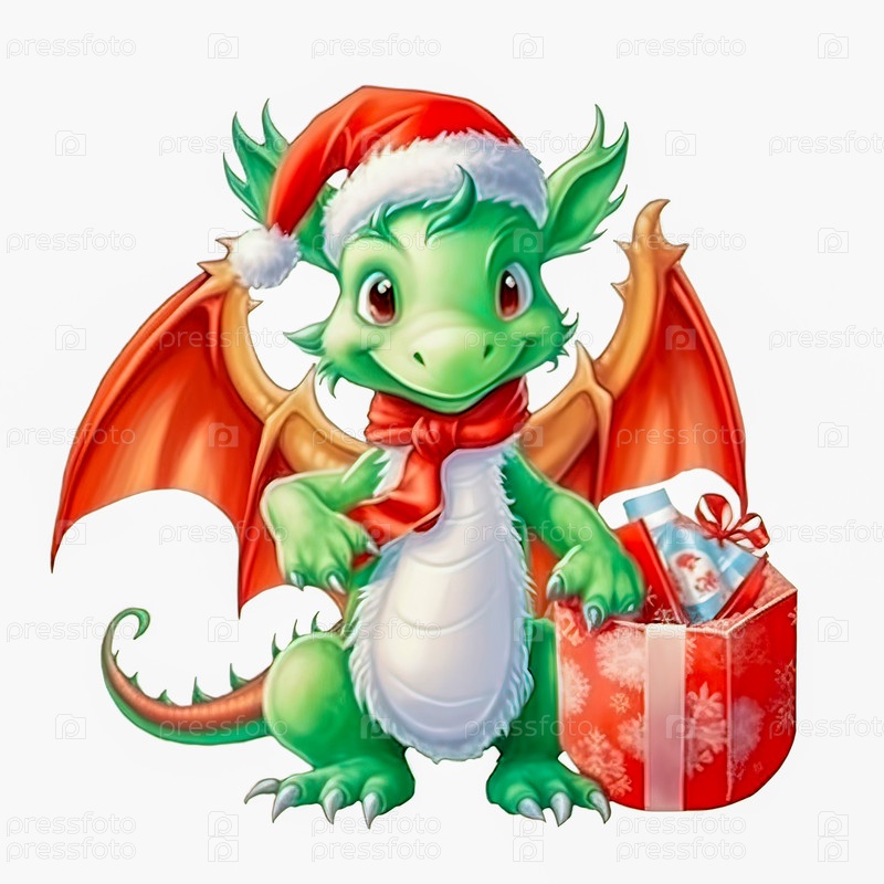 Иллюстрация маленького зеленого дракона в красной кепке с новогодним подарком на белом фоне. Год дракона. Новогодняя иллюстрация. Фото высокого качества