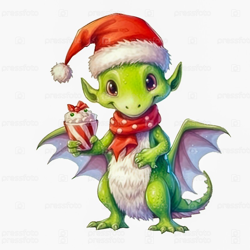Иллюстрация маленького зеленого дракона в красной кепке с чашкой кофе на белом фоне. Год дракона. Новогодняя иллюстрация. Иллюстрация высокого качества