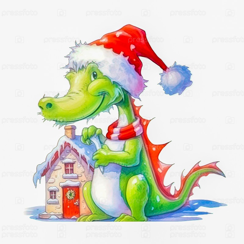 Иллюстрация маленького зеленого дракона в красной кепке с рождественским домиком на белом фоне. Год дракона. Новогодняя иллюстрация. Иллюстрация высокого качества