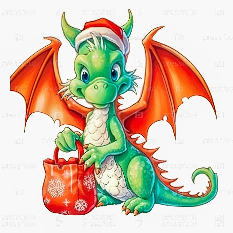 Иллюстрация маленького зеленого дракона в красной кепке с новогодним подарком на белом фоне. Год дракона. Новогодняя иллюстрация. Фото высокого качества