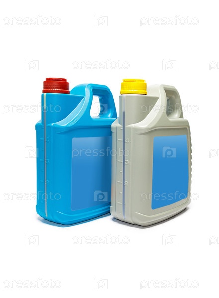 Пластиковая канистра с компрессорным маслом на белом фоне