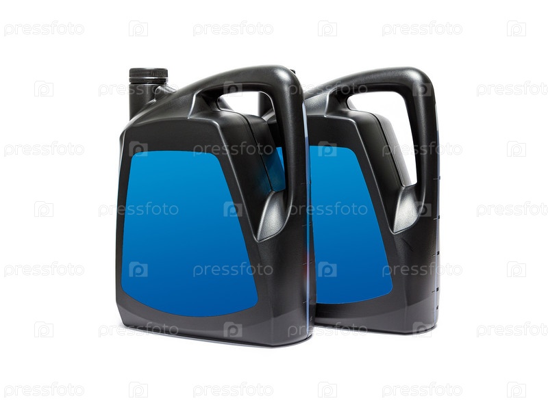 Пластиковая канистра с компрессорным маслом на белом фоне