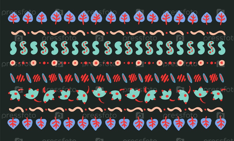 Набор этнических элементов. Бордюр представляет собой полосу с цветами, листьями, ветками, вензелями. Народная вышивка. Славянский, украинский, русский мотив. Хохлома, матрешка, дымковская игрушка. Мексиканский, индийский, цыганский ковер. Вязаное кружево