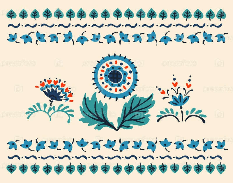 Набор этнических элементов. Бордюр представляет собой полосу с цветами, листьями, ветками, вензелями. Народная вышивка. Славянский, украинский, русский мотив. Хохлома, матрешка, дымковская игрушка. Мексиканский, индийский, цыганский ковер. Вязаное кружево