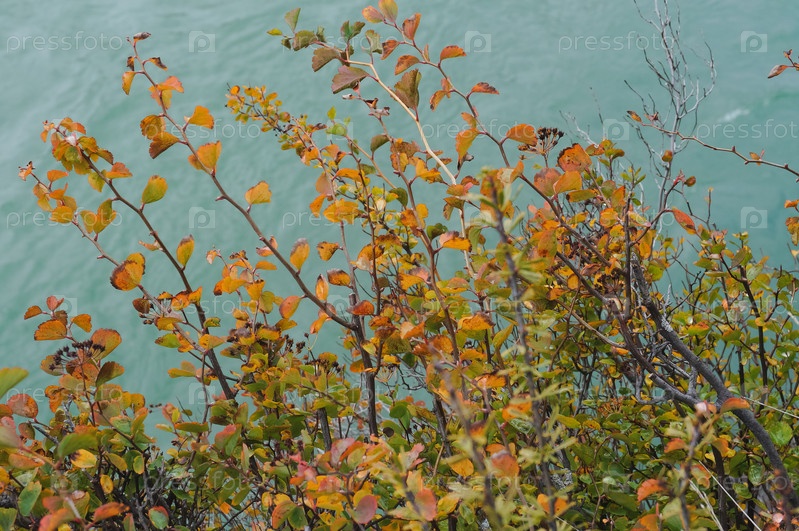 Осенний куст с оранжевыми листьями на фоне бирюзовой воды