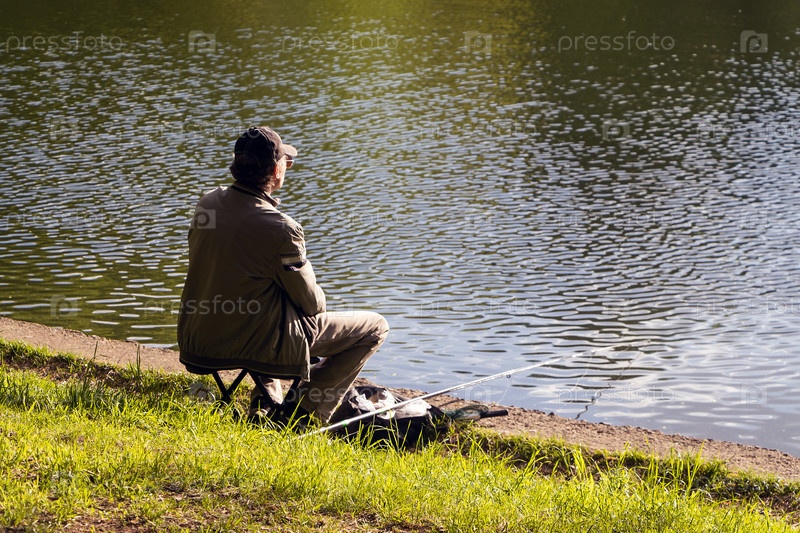 Мужчина ловит рыбу на пруду