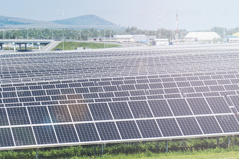 Солнечная электростанция, панели солнечных модулей на фоне неба