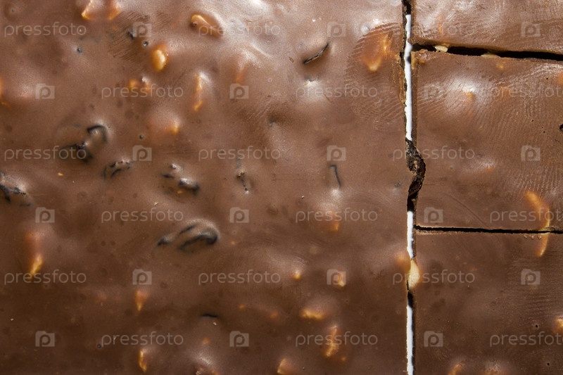 Молочный шоколад с измельченными орехами, вид сверху.The texture of milk chocolate with crushed nuts