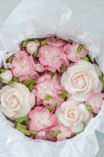 Зефирный букет цветов в подарочной коробке на светлом фоне