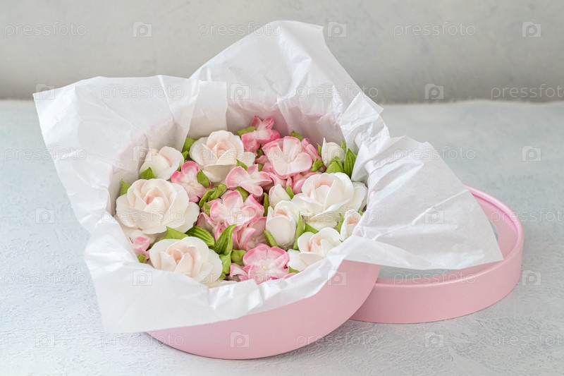 Зефирный букет цветов в подарочной коробке на светлом фоне