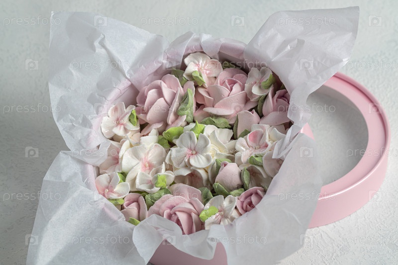 Зефирный букет цветов в подарочной коробке на светлом фоне