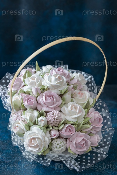 Зефирный букет цветов в подарочной коробке на синем фоне