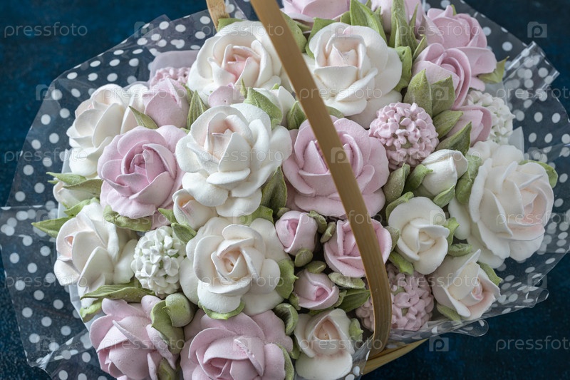 Зефирный букет цветов в подарочной коробке на синем фоне