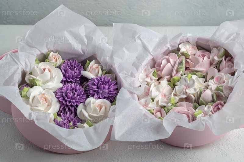 Зефирный букет цветов в подарочной коробке на светлом фоне