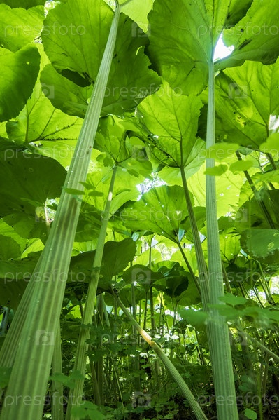 Большие листья лопуха в лесу