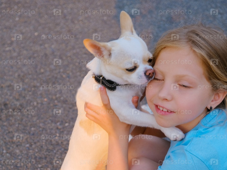 Собака чихуахуа обнимает свою подругу девочку