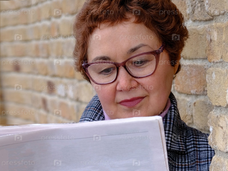 Женщина в возрасте в очках читает газету на фоне кирпичной стены
