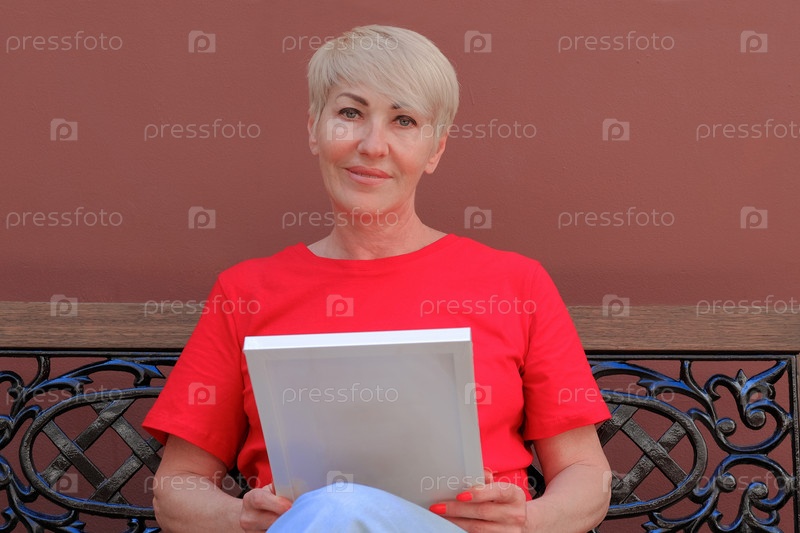 Женщина блондинка с короткой стрижкой сидит на скамейке и держит в руках белую фоторамку