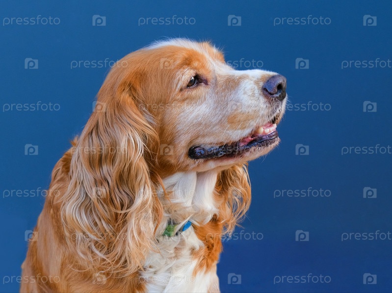 Профиль рыжего с белыми пятнами русского спаниеля на синем фоне