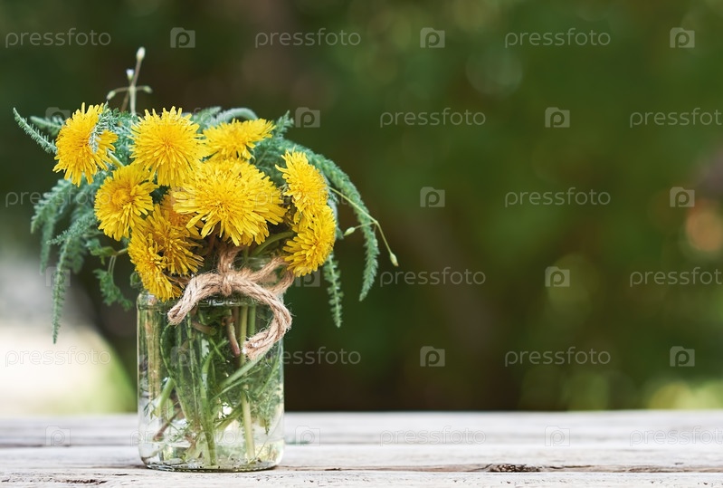 Букет одуванчиков в стеклянной банке, летний фон
