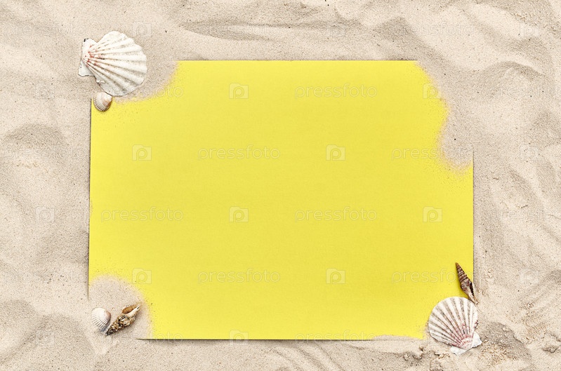 Желтый лист бумаги на песке, летний фон
