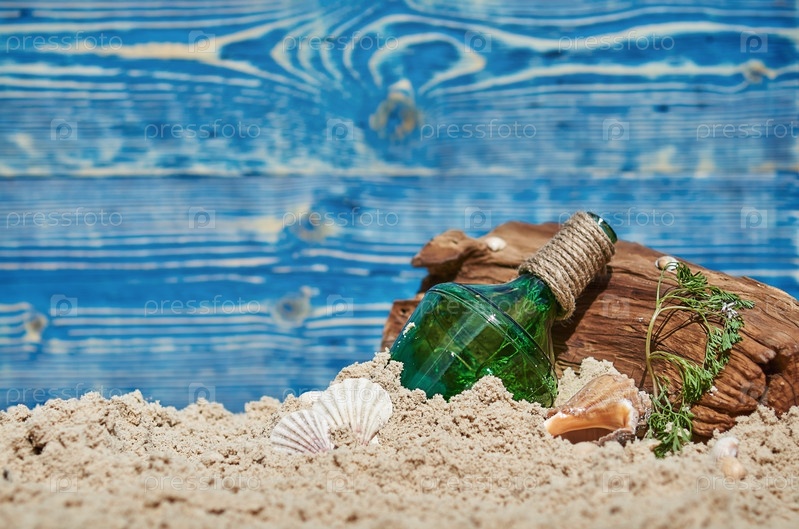 Летний фон с песком и бутылкой