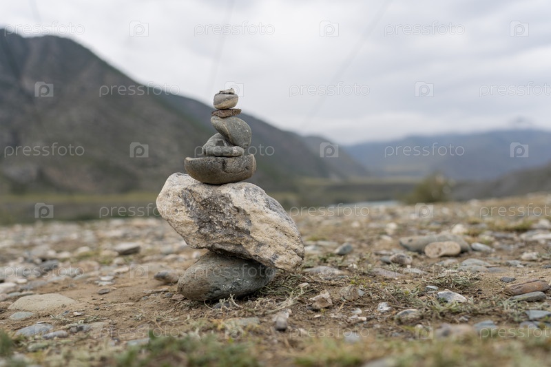 Каменная стопка со сбалансированными камнями на размытом фоне гор, крупный план каменных весов, тонированное изображение, выборочная фокусировка, солнечные блики