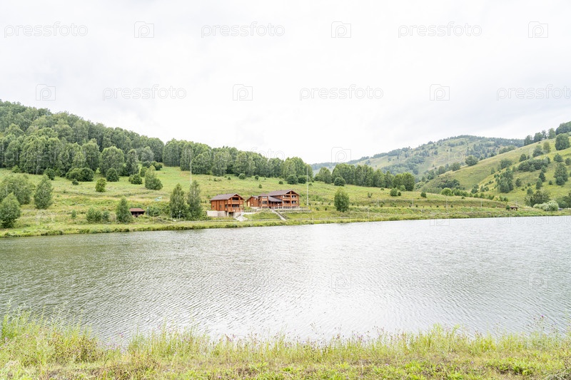 Деревянный дом на берегу озера в горах, база отдыха у озера