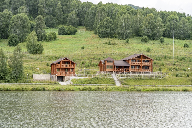 Деревянный дом на берегу озера в горах, база отдыха у озера