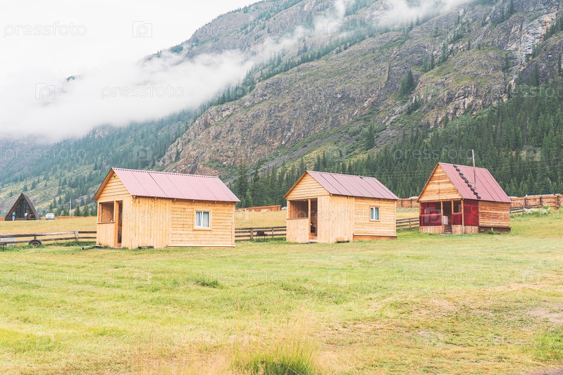 Деревянный дом в горах, база отдыха в горах, коттеджи в долине гор, отдых в горах на свежем горном воздухе, выборочная фокусировка, тонированное изображение, солнечные блики