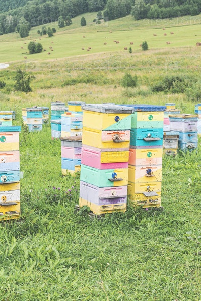 Пчелиные ульи в горах, сбор редкого меда в горной местности, ряд пчелиных ульев в поле в горах. Пчеловодство. Сельский пейзаж с ульями. Выборочная фокусировка. тонированное изображение, солнечные блики