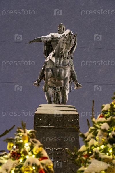Москва, Россия, 11 января 2021 г., памятник Юрию Долгорукову в Москве ночью в снежную погоду
