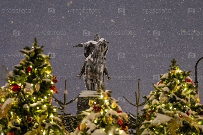 Москва, Россия, 11 января 2021 г., памятник Юрию Долгорукову в Москве ночью в снежную погоду
