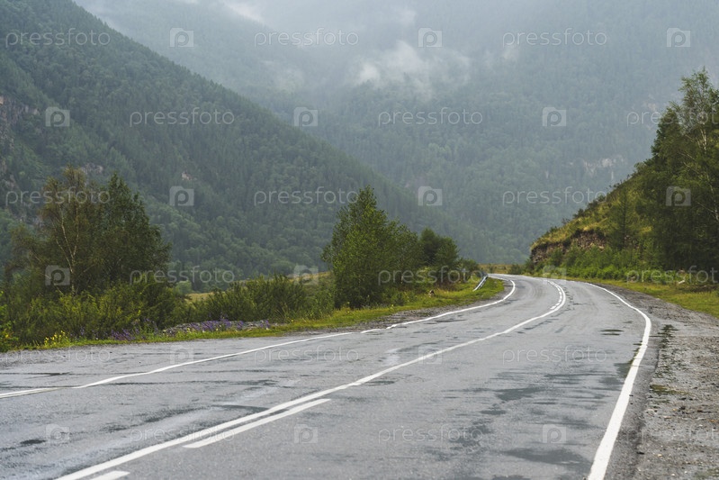 Живописный вид на изгиб шпильки мокрой извилистой дороги через перевал, часть горного серпантина в пасмурную погоду с туманом