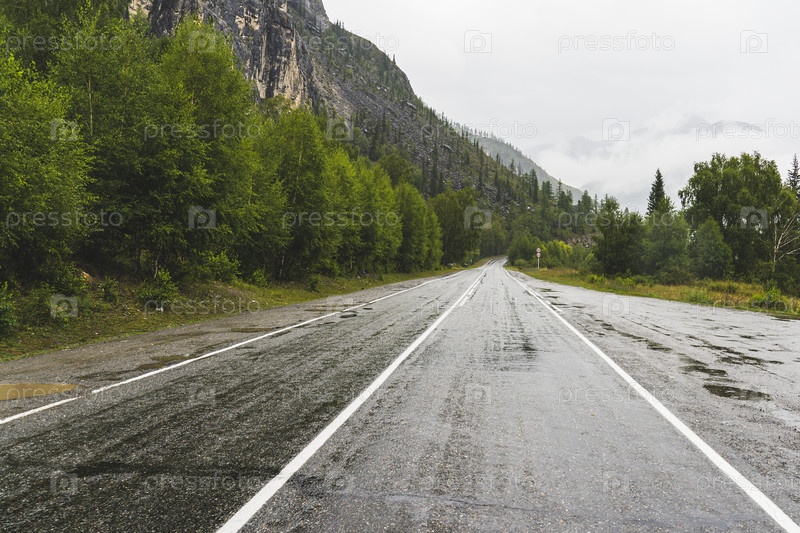 Живописный вид на изгиб шпильки мокрой извилистой дороги через перевал, часть горного серпантина в пасмурную погоду с туманом