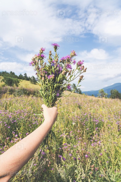 Букет полевых цветов в руке женщины. На фоне высоких гор выборочная фокусировка, тонированные блики изображения от солнца. Рука молодой белой кавказской женщины держит букет полевых цветов