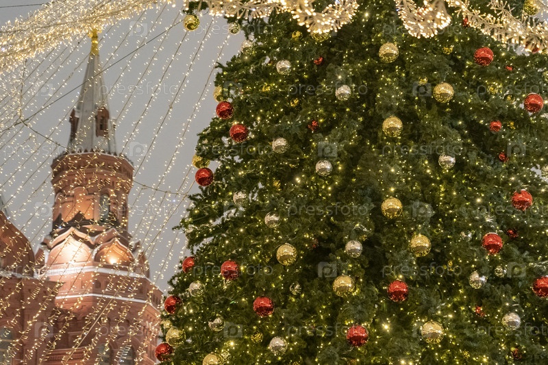 Новогодняя елка в Москве, новогоднее и рождественское украшение улиц города. красивое освещение различных городских зданий на Рождество в Москве