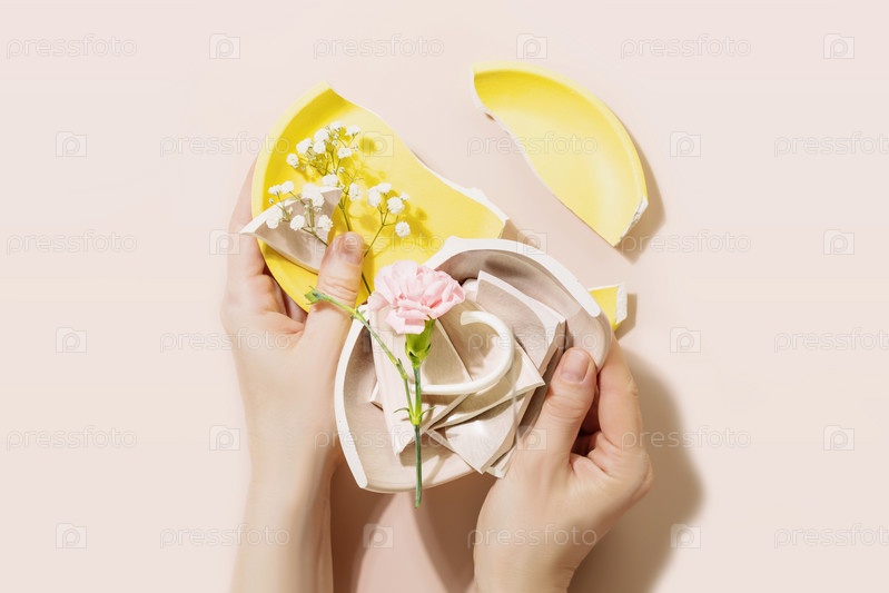 Женские руки держат кусочки разбитой тарелки с нежным цветком на розовом фоне. Концепция или метафора развода, отношений, дружбы и любви. Монохромная пастельная гамма. Плоская планировка