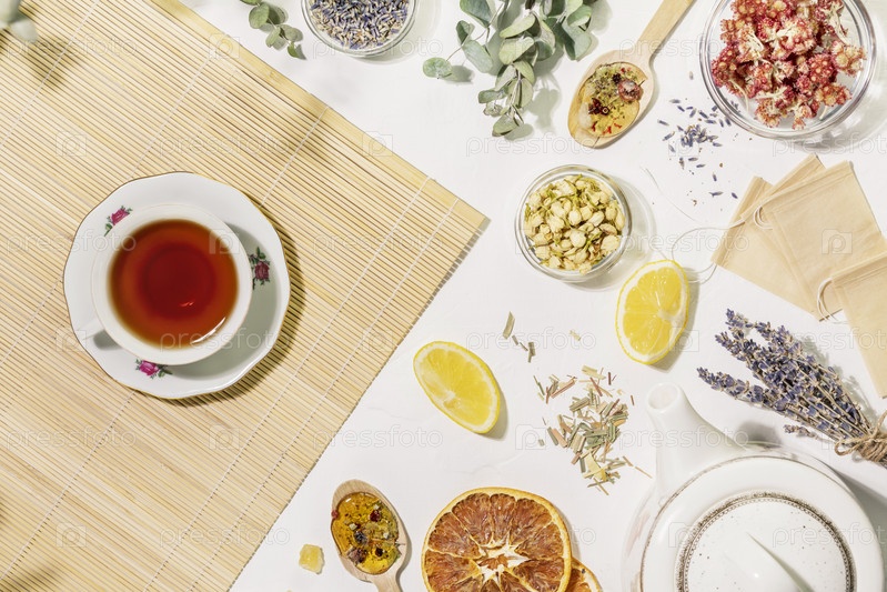 Плоская кладка с сухими цветами и травами, бумажными чайными пакетиками, чайником и чашкой чая