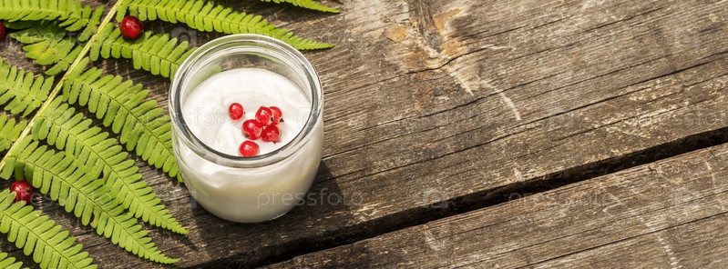 Веганский домашний йогурт с красной смородиной и листьями папоротника на деревянном столе