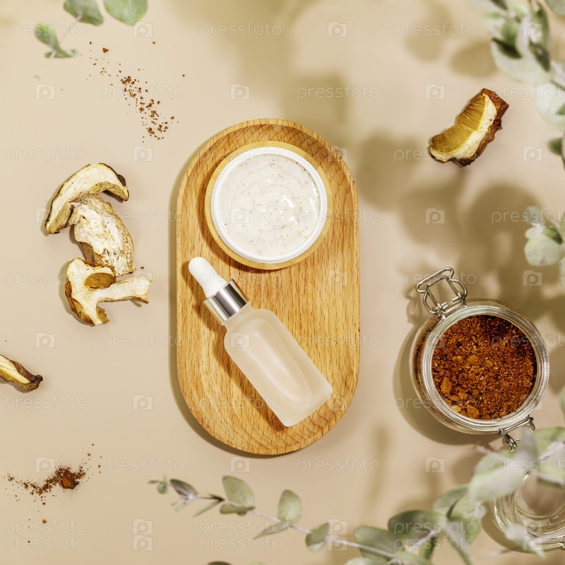 Бутылка с моющим средством для посуды на чистой тарелке на синем фоне