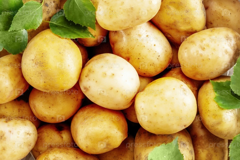 Молодой органический картофель нового урожая с зелеными листьями. Продажа сезонных натуральных овощей на местном рынке. Местные фермеры овощи и концепция сбора урожая. Плоская планировка, крупным планом