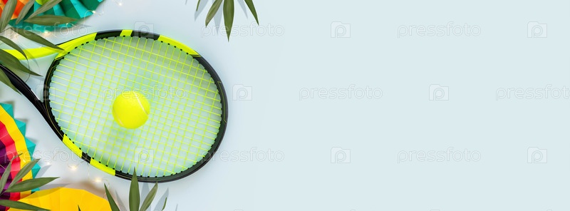 Теннис, летний баннер с ракеткой, желтый теннисный мяч, красочные бумажные веера и пальмовые листья на синем фоне с местом для текста. Соревнования по теннису. Плоская планировка, размер баннера, пространство для копирования
