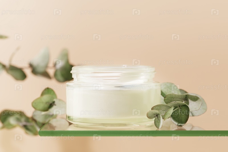 Косметическая банка с натуральным кремом на стеклянной полке с веточками эвкалипта